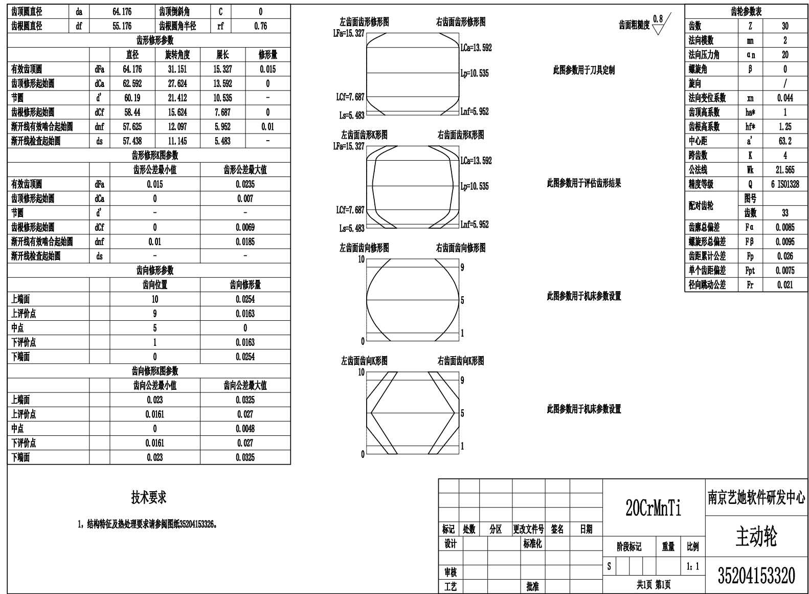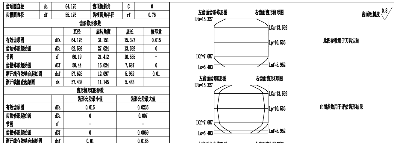 This modification parameter tells us: at gear diameter 64.176 mm, the corresponding theoretical roll length is 15.327 mm, with a modification amount of 0.015 mm — meaning the stylus position on the involute needs to be 15.327−0.015 mm when the gear rotation angle is 31.151°. At gear diameter 62.592 mm, the corresponding theoretical roll length is 13.592 mm, with zero modification — the stylus position on the involute needs to be 13.592−0 mm when the gear rotation angle is 27.624°.